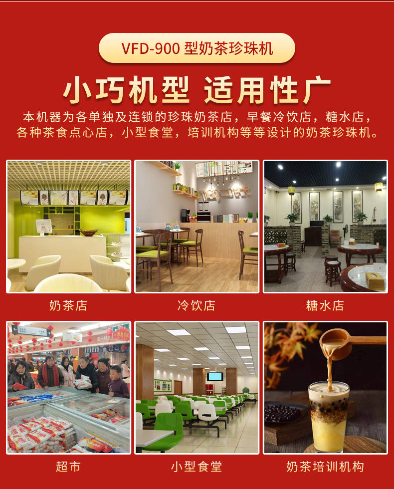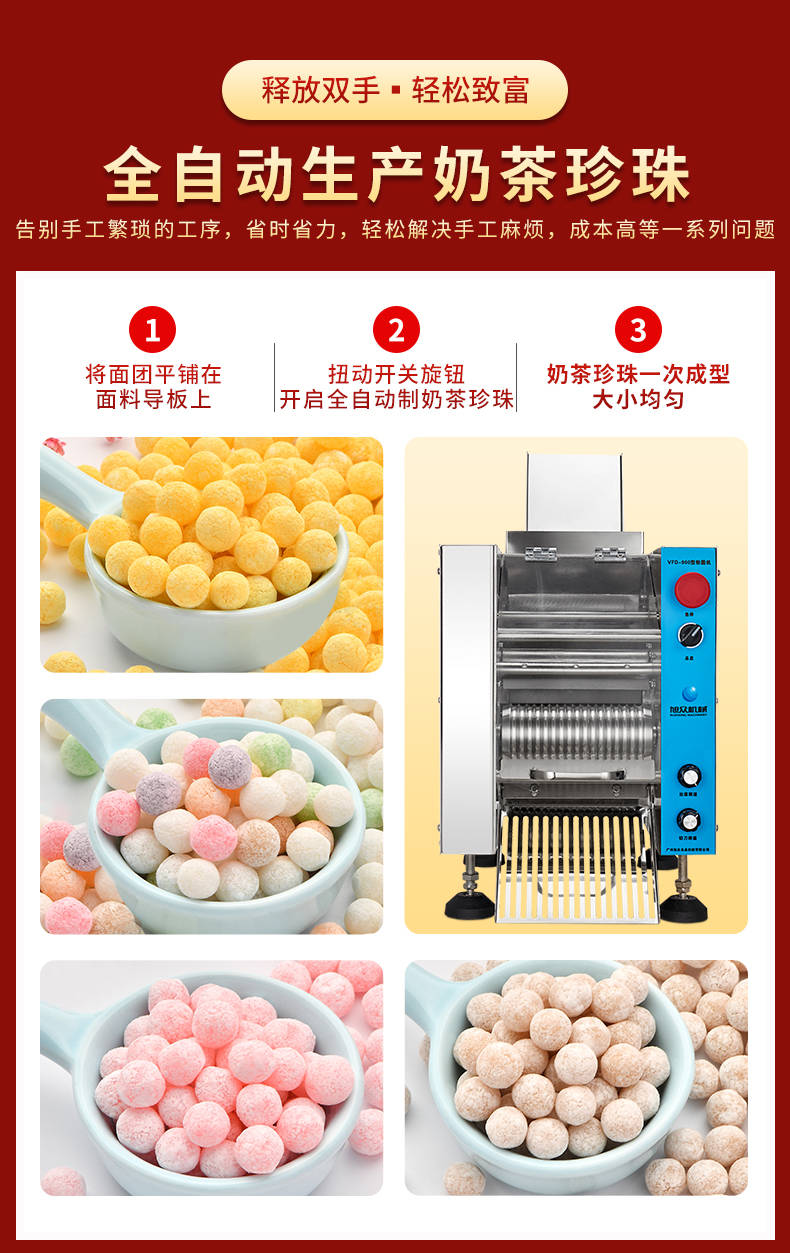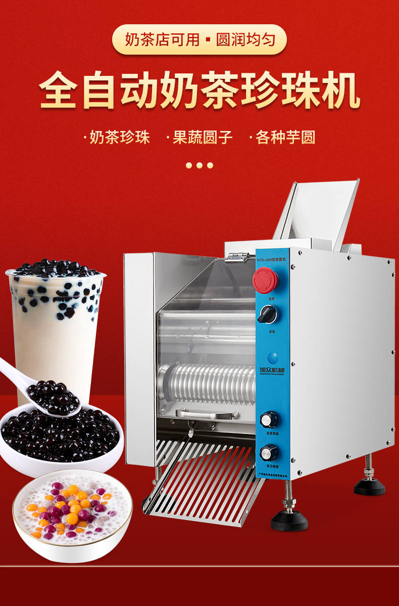 VFD-900珍珠奶茶機,奶茶店、甜品店可用。可生產(chǎn)奶茶珍珠,果蔬圓子,無餡湯圓,水晶湯圓,各種芋圓。不占空間、體積小、重量輕,桌面上的小奶茶珍珠機。告別手工繁瑣的工序,省時省力,輕松解決手工麻煩,成本高等一系列問題