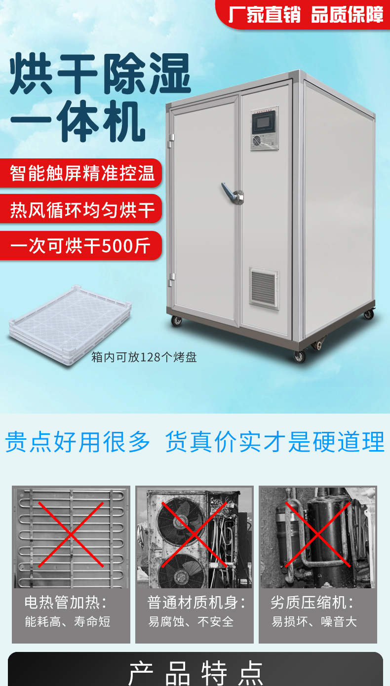 烘干除濕一體機,烘干除濕體機,智能觸屏精準控溫?zé)犸L(fēng)循環(huán)均勻烘干次可烘干500斤,智能烘干時代出類拔萃的新體驗,1度電能=4度,熱能比傳統(tǒng)電加熱。干燥設(shè)備減少60%以上電能消耗。