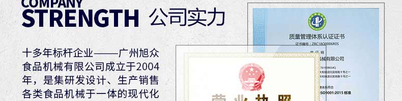 廣州旭眾食品機(jī)械有限公司是一家集科研開(kāi)發(fā),生產(chǎn)設(shè)計(jì),營(yíng)銷(xiāo)服務(wù)為一體的現(xiàn)代化生產(chǎn)企業(yè)。現(xiàn)代化生產(chǎn)車(chē)間,精湛制造技術(shù),所產(chǎn)機(jī)械歷經(jīng)市場(chǎng)重重考驗(yàn),不斷贏得海內(nèi)外客戶(hù)的贊譽(yù)。