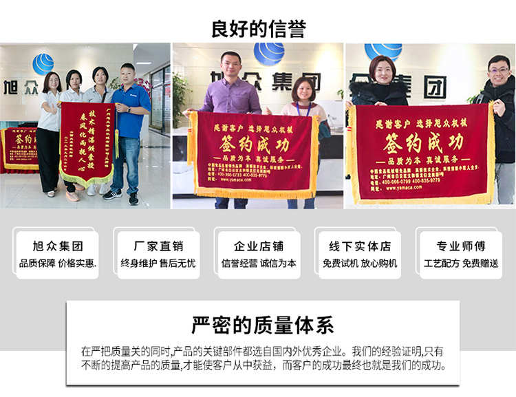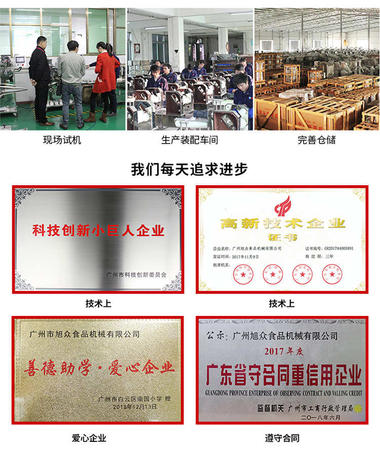 廣州旭眾食品機械有限公司是一家集科研開發(fā),生產(chǎn)設計,營銷服務為一體的現(xiàn)代化生產(chǎn)企業(yè)。現(xiàn)代化生產(chǎn)車間,精湛制造技術,所產(chǎn)機械歷經(jīng)市場重重考驗,不斷贏得海內(nèi)外客戶的贊譽。