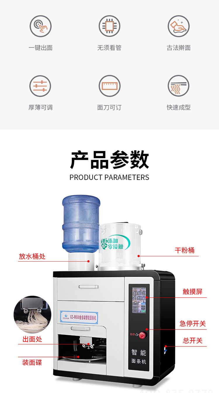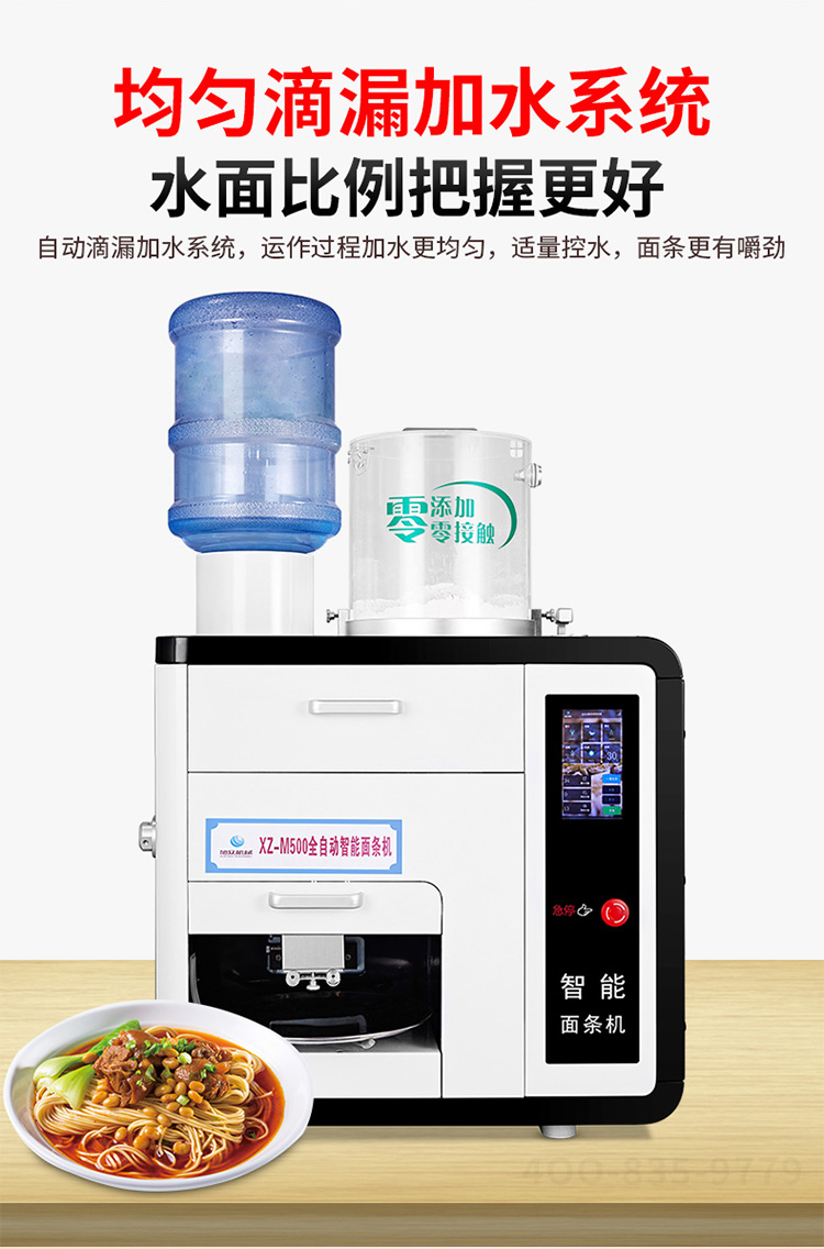 全自動商用快速出面電動素面濕面M500臺式制面機器,20秒全自動出面,全程無需看管。一鍵出面,面做好,自動停。均勻滴漏加水系統(tǒng),水面比例把握更好。自動滴漏加水系統(tǒng),運作過程加水更均勻,適量控水,面條更有嚼勁。