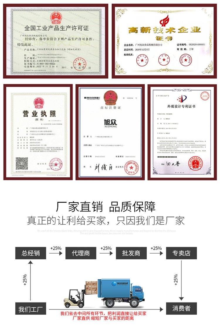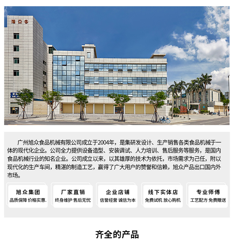 廣州旭眾食品機械有限公司是一家集科研開發(fā),生產(chǎn)設計,營銷服務為一體的現(xiàn)代化生產(chǎn)企業(yè)?,F(xiàn)代化生產(chǎn)車間,精湛制造技術(shù),所產(chǎn)機械歷經(jīng)市場重重考驗,不斷贏得海內(nèi)外客戶的贊譽。