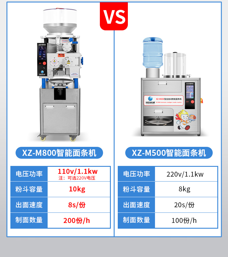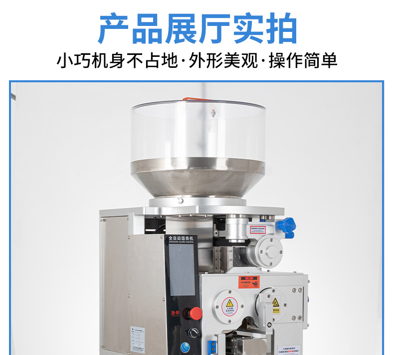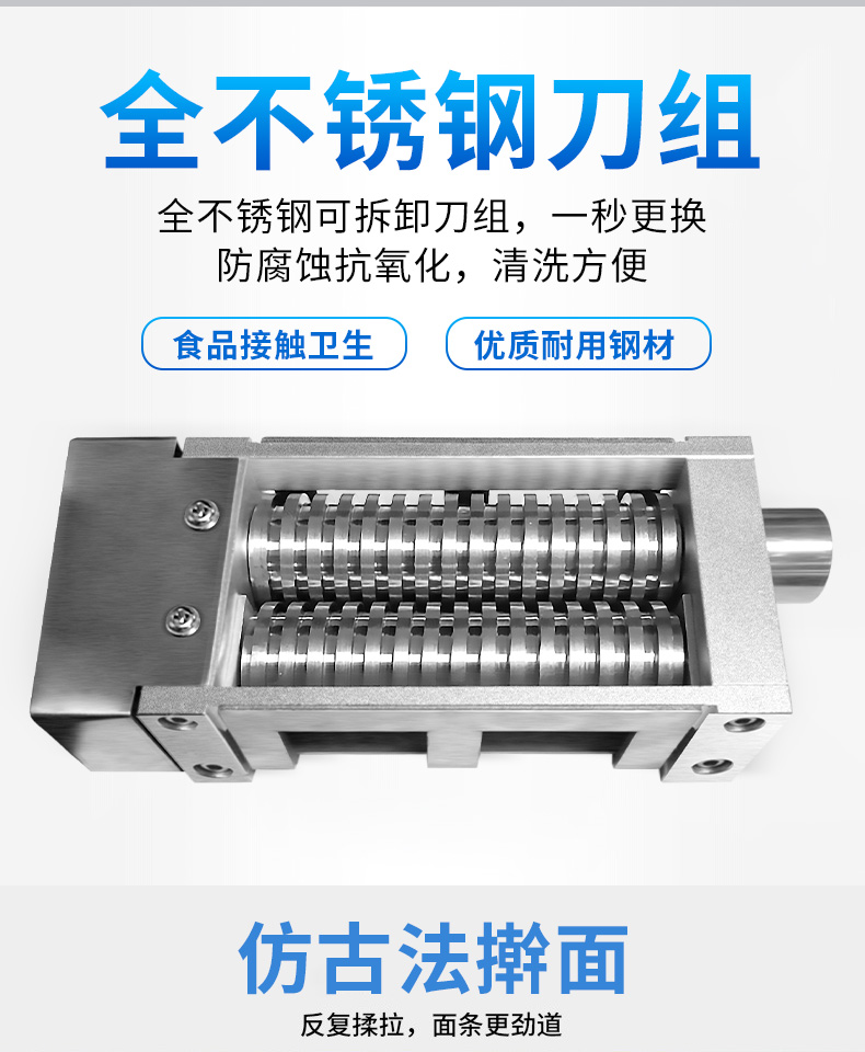 XZ-M800面條機(jī),制作多種面條:拉面、小面、牛肉面、韭葉面板面、褲帯面、蔬菜面、水果面、雜糧面8秒快速出面人性化設(shè)計,更便捷更高效與同類型機(jī)器相比,出面更快、秒換刀具。全不銹鋼刀組全不銹鋼可拆卸刀組,一秒更換防腐蝕抗氧化,清洗方便。