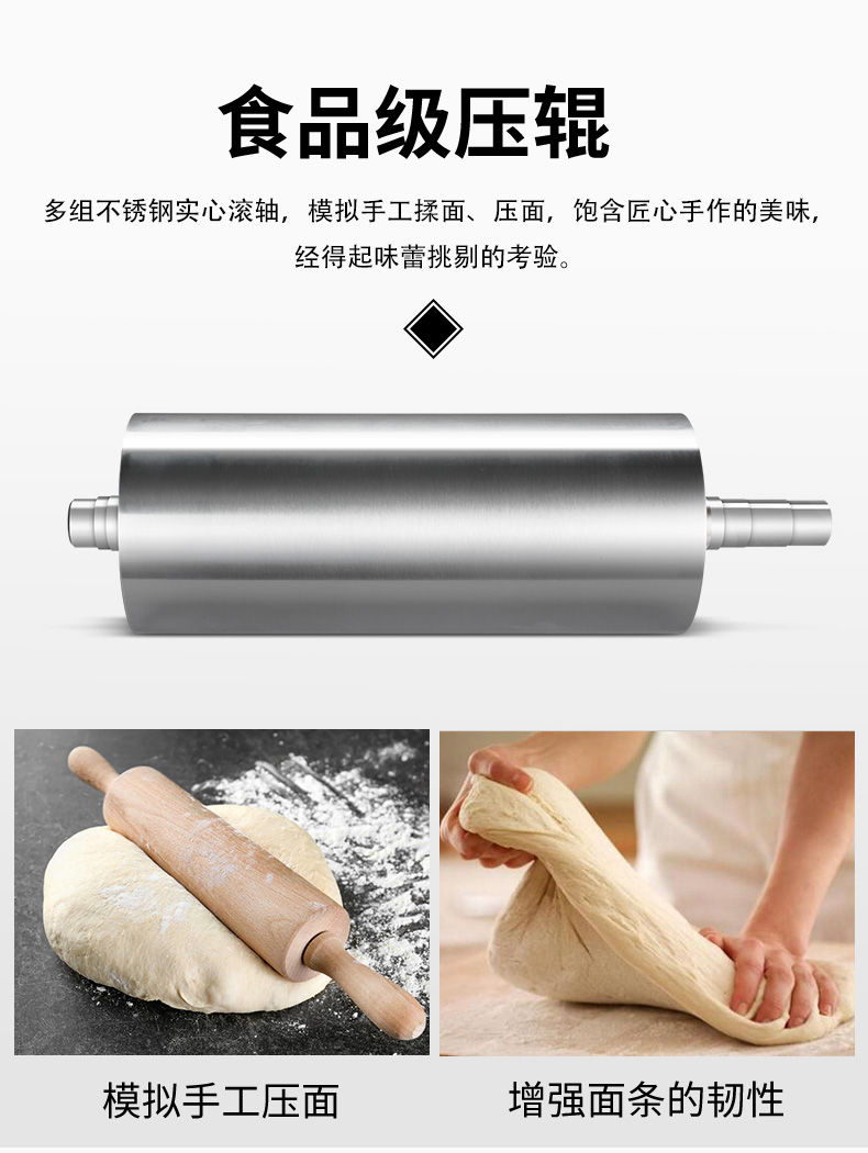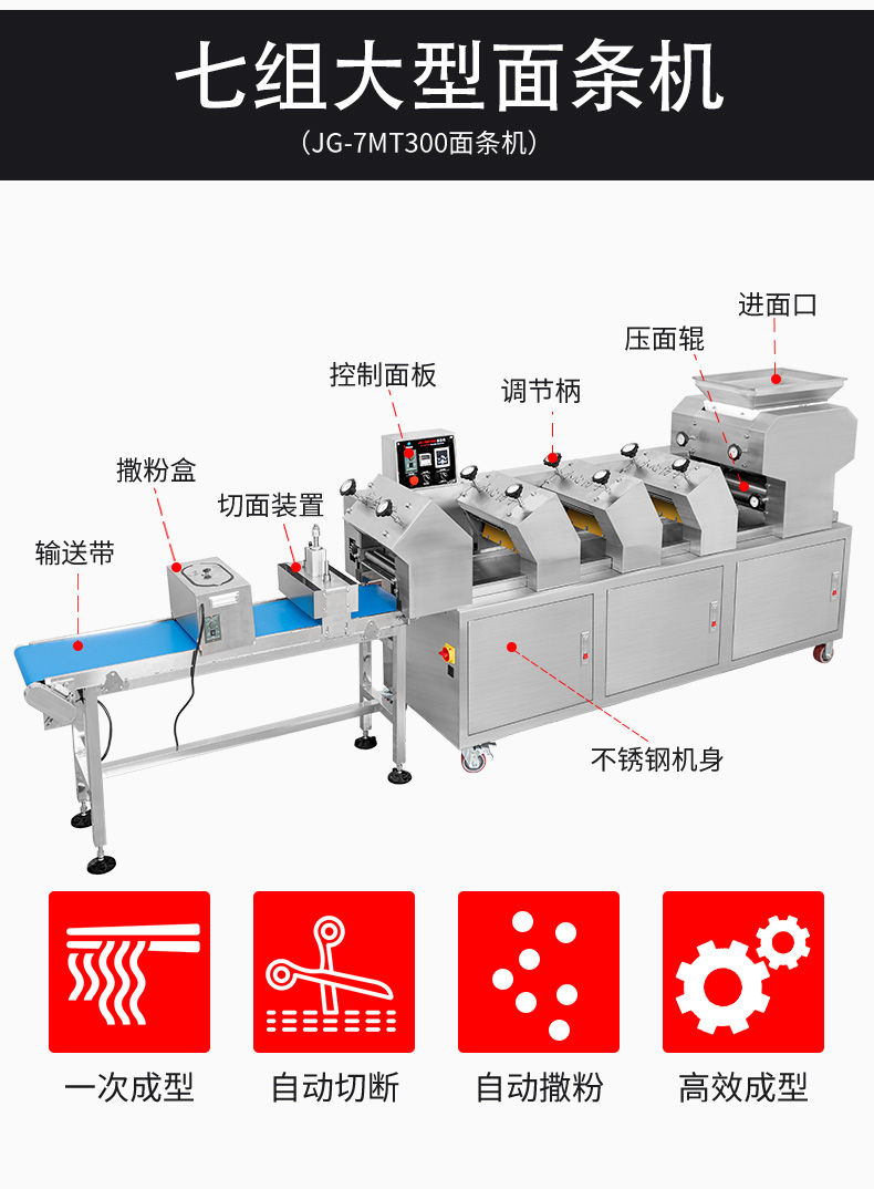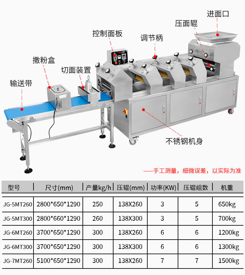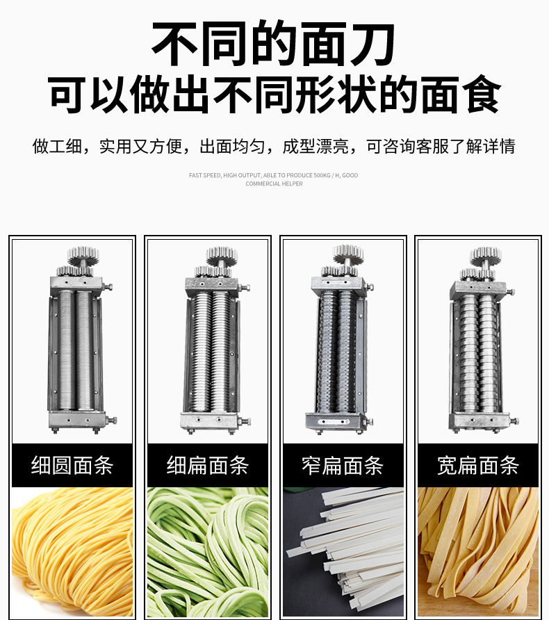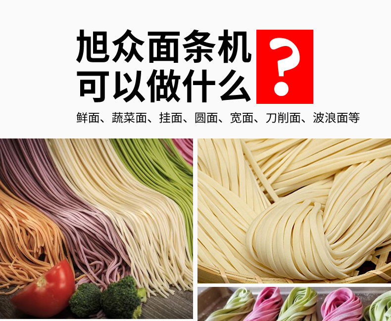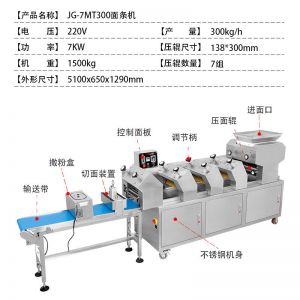 JG-7MT300面條機(jī),多種功能一機(jī)搞定比傳統(tǒng)手工做面條,省時省力??梢宰鍪裁歹r面、蔬菜面、掛面、圓面、寬面、刀削面、波浪面等。不同的面刀可以做出不同形狀的面食做工細(xì),實用又方便,出面均勻,成型漂亮。