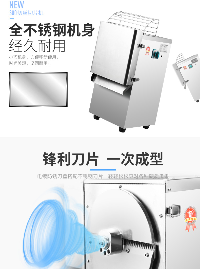 300型瓜果切絲切片機(jī),高效便捷、一次成型、每小時(shí)可切200-300KG。全不銹鋼機(jī)身經(jīng)久耐用小巧機(jī)身,方便移動(dòng)使用,時(shí)尚美觀,堅(jiān)固耐用。鋒利刀片、一次成型。電鍍防銹刀盤搭配不銹鋼刀片,輕輕松松應(yīng)對(duì)各種硬質(zhì)瓜果。