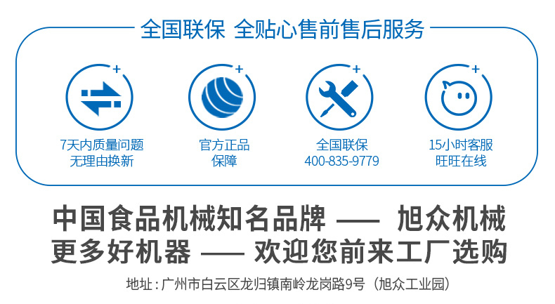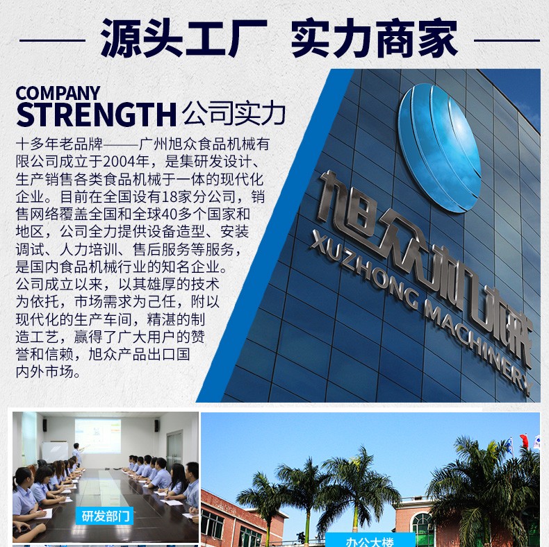 廣州旭眾食品機(jī)械有限公司是一家集科研開發(fā),生產(chǎn)設(shè)計(jì),營銷服務(wù)為一體的現(xiàn)代化生產(chǎn)企業(yè)?,F(xiàn)代化生產(chǎn)車間,精湛制造技術(shù),所產(chǎn)機(jī)械歷經(jīng)市場重重考驗(yàn),不斷贏得海內(nèi)外客戶的贊譽(yù)。